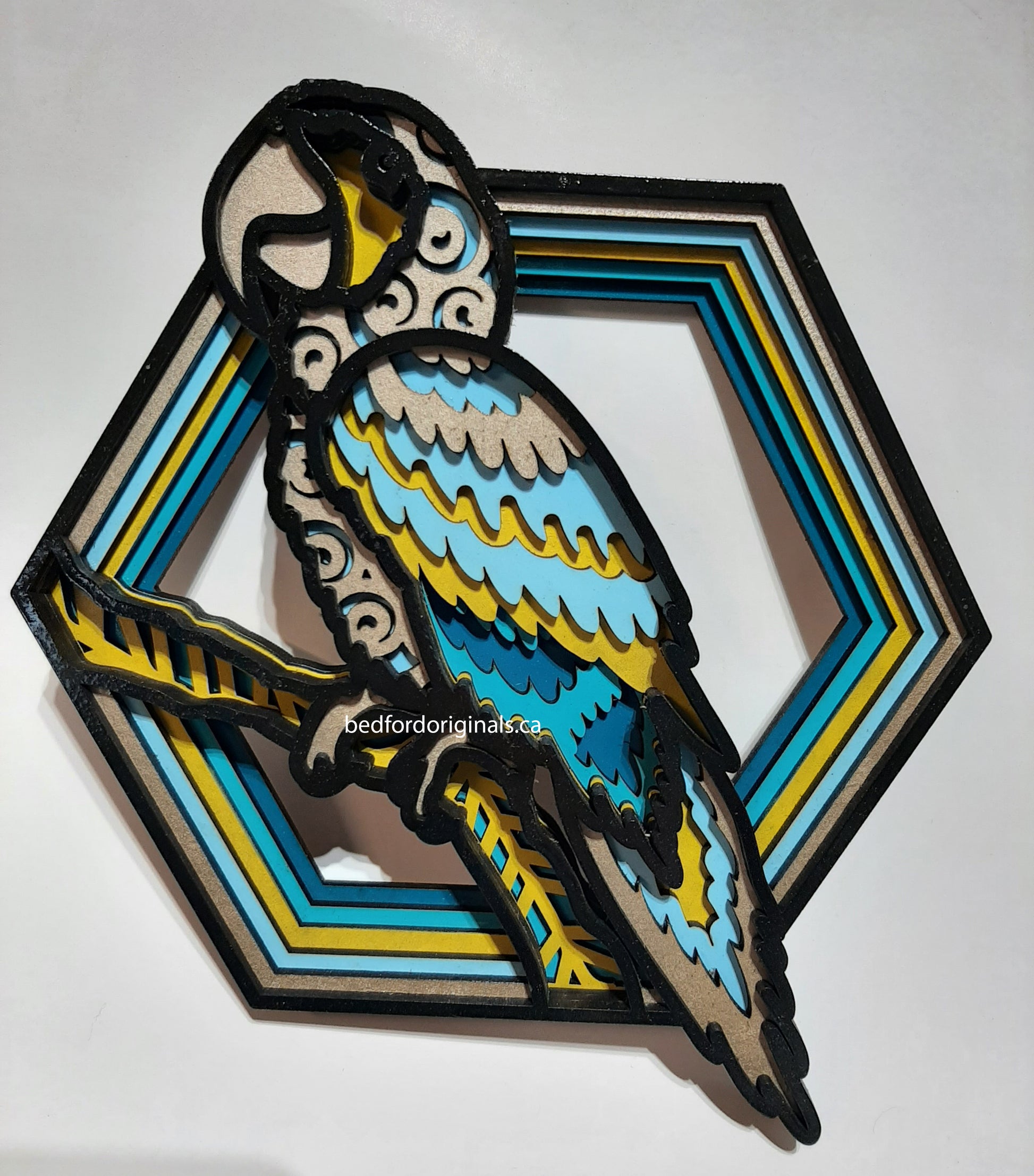 Precision laser cut art piece featuring 6 layers of 1/8" Wood.