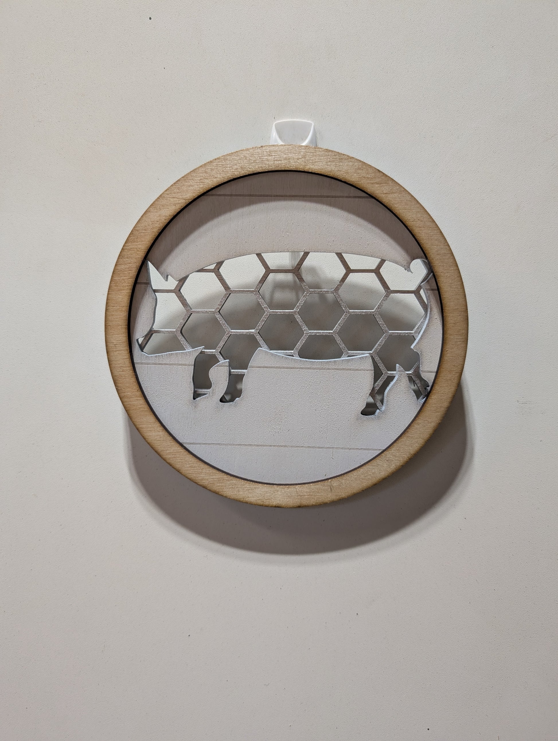 These decor pieces have a silveress style base, a white shiplap animal cutout layer, and a golden pecan stained frame layer.