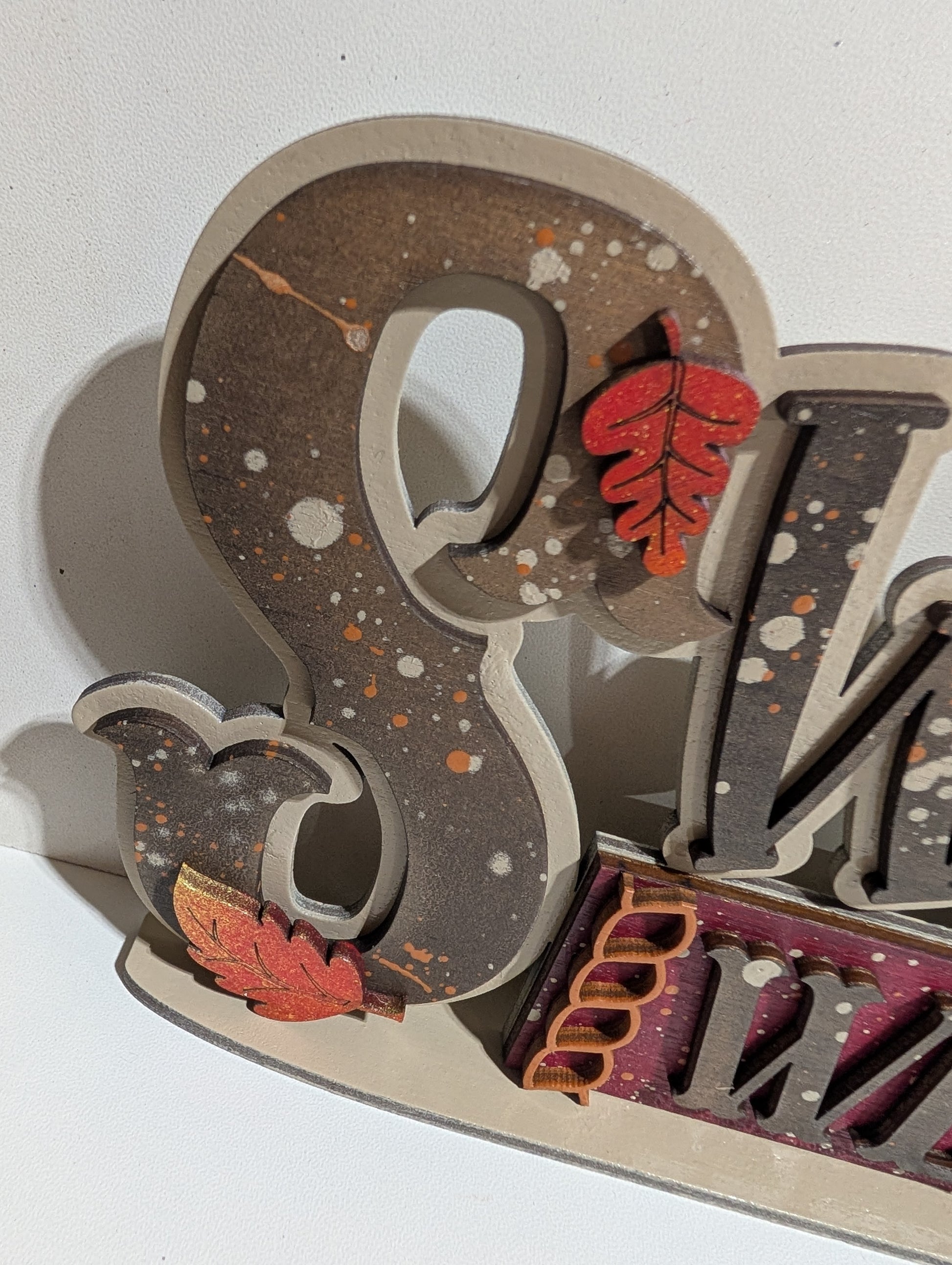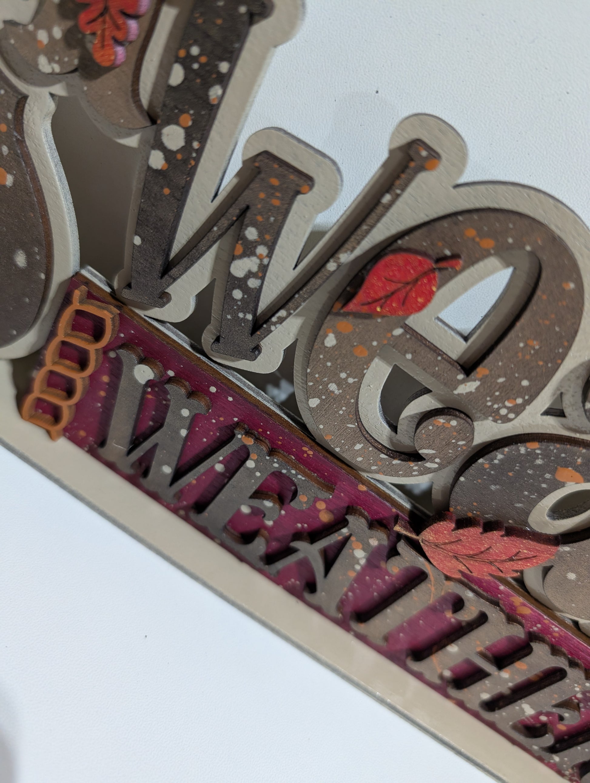 Precision laser cut art piece featuring multiple layers of 1/8" Baltic Birch Wood. This sweater sign would look great on any shelf or mantle this fall season!